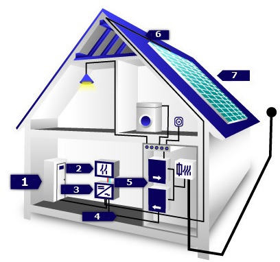 1. Solarspeicher (optional) | 2. DC Trenner | 3. Wechselrichter | 4. AC Einspeisung | 5. Sicherungsfeld | 6. DC Kabel | 7. Solarmodule